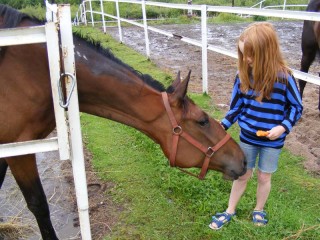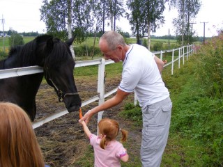 Vi kan inte åka till Boden utan att hälsa på hästarna. Min pappa hjälper en hästägare med hans travhästar. Den här gången besökte vi hästarna i hagen efter att morfar och Moa inhandlat lite morötter.