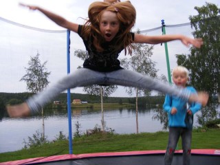Min syster hade införskaffat en studsmatta för att kunna trötta ut sina barn när den är på väg att rinna över. Detta är ett fenomen som jag känner igen hos mina egna barn. Jag har varit lite negativt inställd till dessa leksaker eftersom många får skador. Nu har jag börjat tänka om. Man såg stor skillnad från dag ett till två när Ida hoppade. Första dagen ramlade hon så fort den andra personen hoppade. Dag två kunde hon hålla balansen utan problem. En ska som jag tror är viktig är att man inte ska hoppa fler än två samt att man ska hoppa med någon i samma storlek. Vi får se,kanske blir det även en studsmatta för familjen Lundström-Hultin. En bra träningsgrej även för en mamma! :tongue: