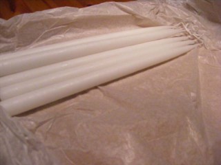 Härom kvällen fick jag nöjet att delta på en ljusstöpning. Riktigt roligt! Men jag tror att man skulle få ont i axlarna om man skulle ha det som heltidsjobb. Men jag lyckades få till sex stycken, nästan helt släta ljus. Inte illa för en nybörjare! :tongue: