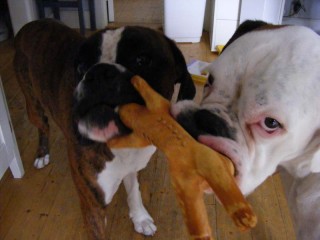 Grim fick en leksaksgris av sin husse när vi var borta. Blev kärlek vid första ögonkastet. Husse ångrade nog sitt köp när han blev väckt av en alldeles dregglig gris och en lycklig Grim kl 2 på natten. När sen familjens stora vita kom hem blev det en tyst maktkamp om denna fina gris. Men det verkar som om dom har kommit överens om att dela på vårdnaden. Riktig syskonkärlek.